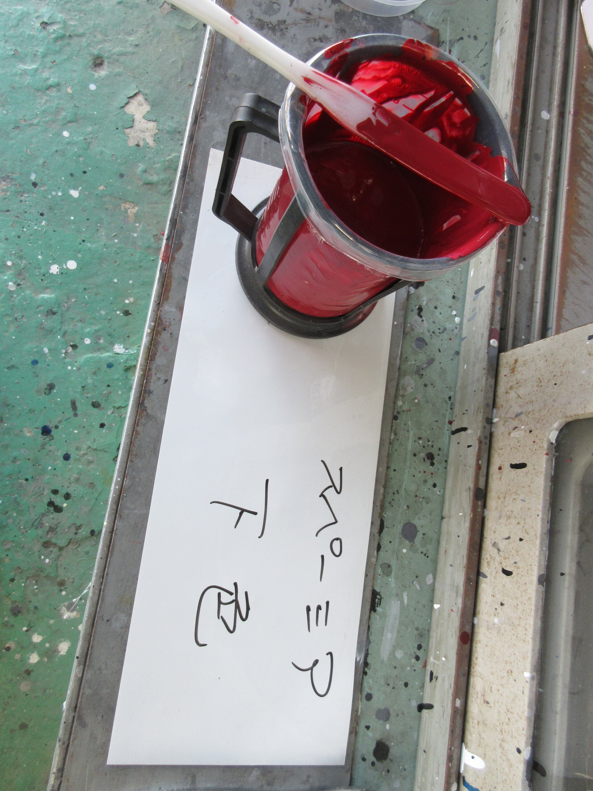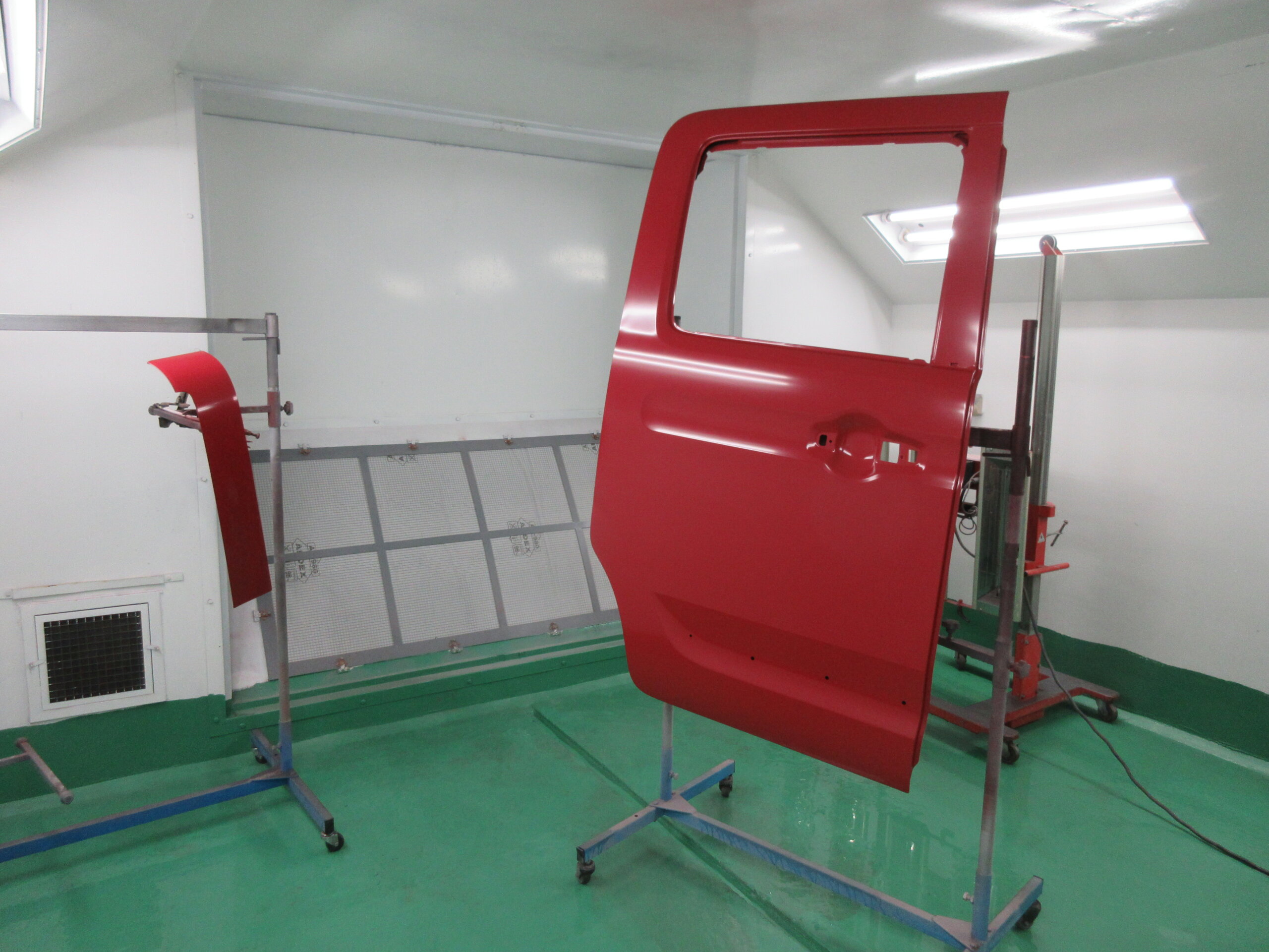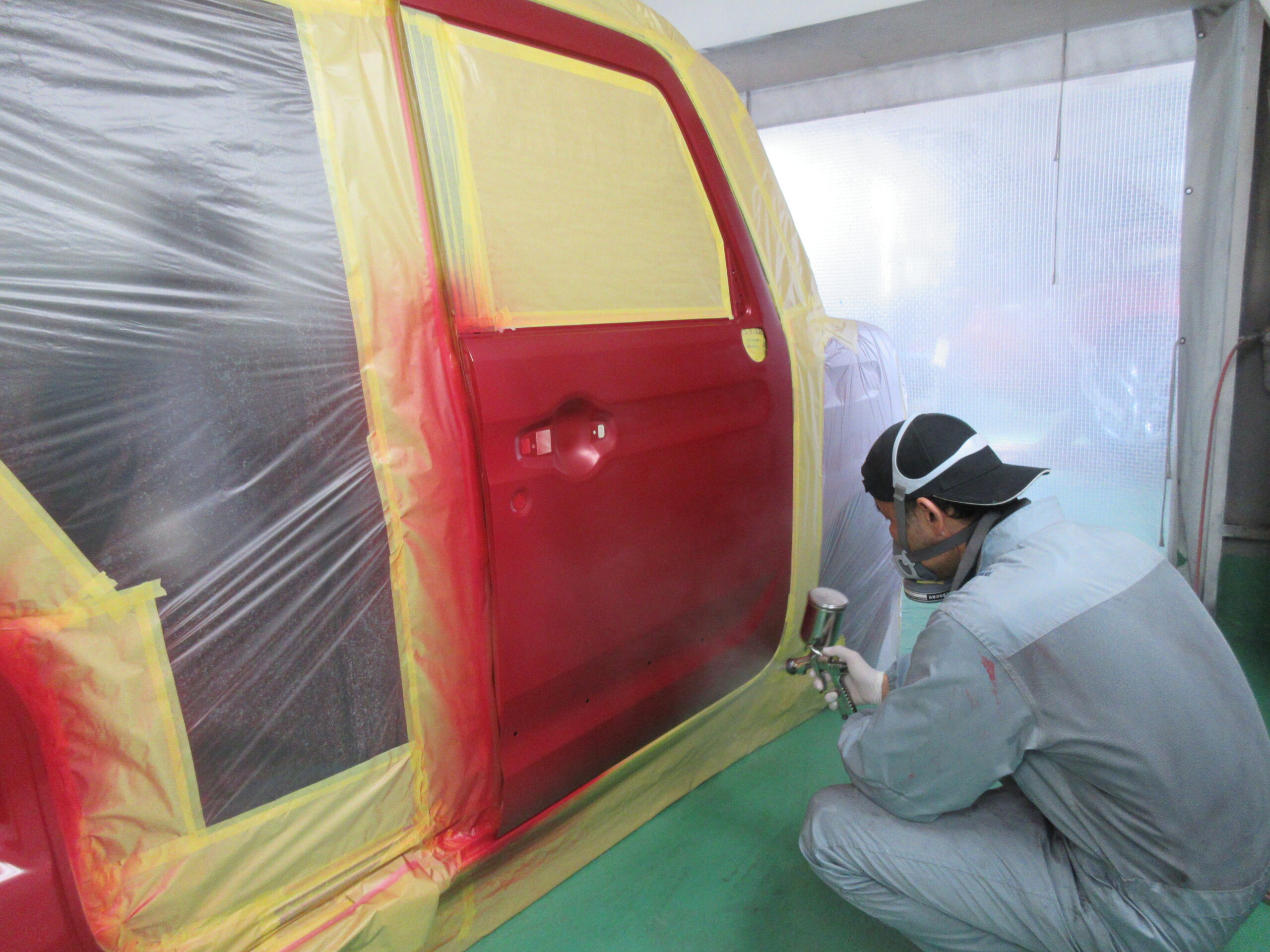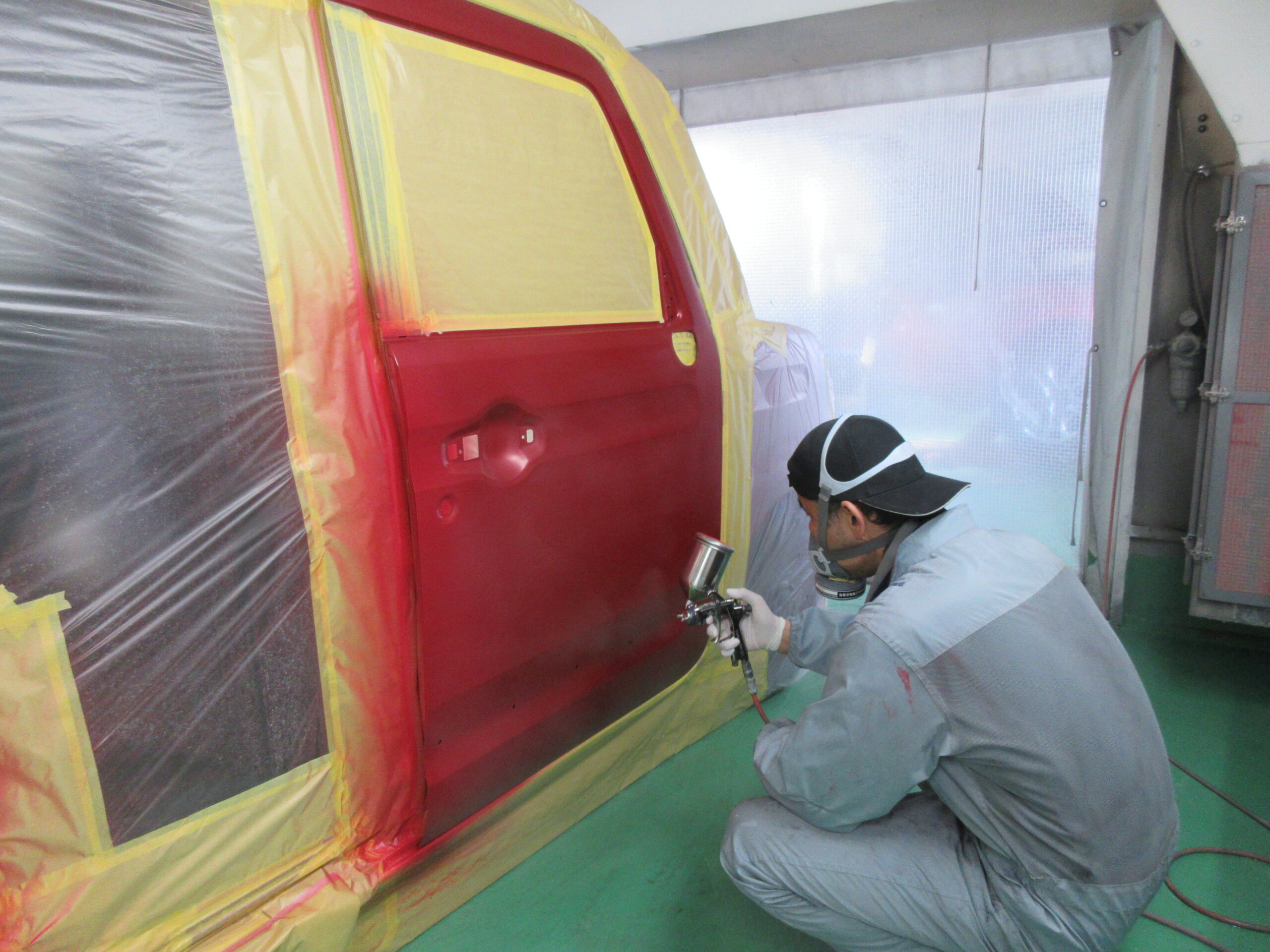 調色(色合わせ)作業で、何度も試し塗り板に塗装し、実車と見比べ色を近づけていくという、スタッフの経験と、感性が要求されます。