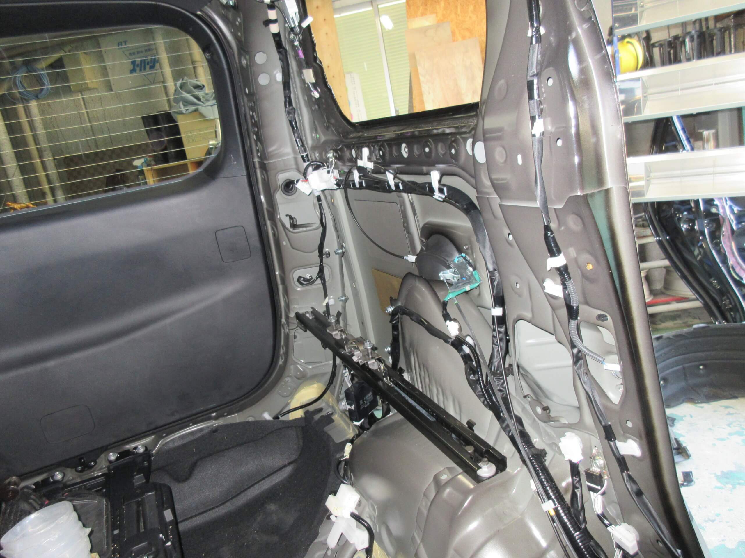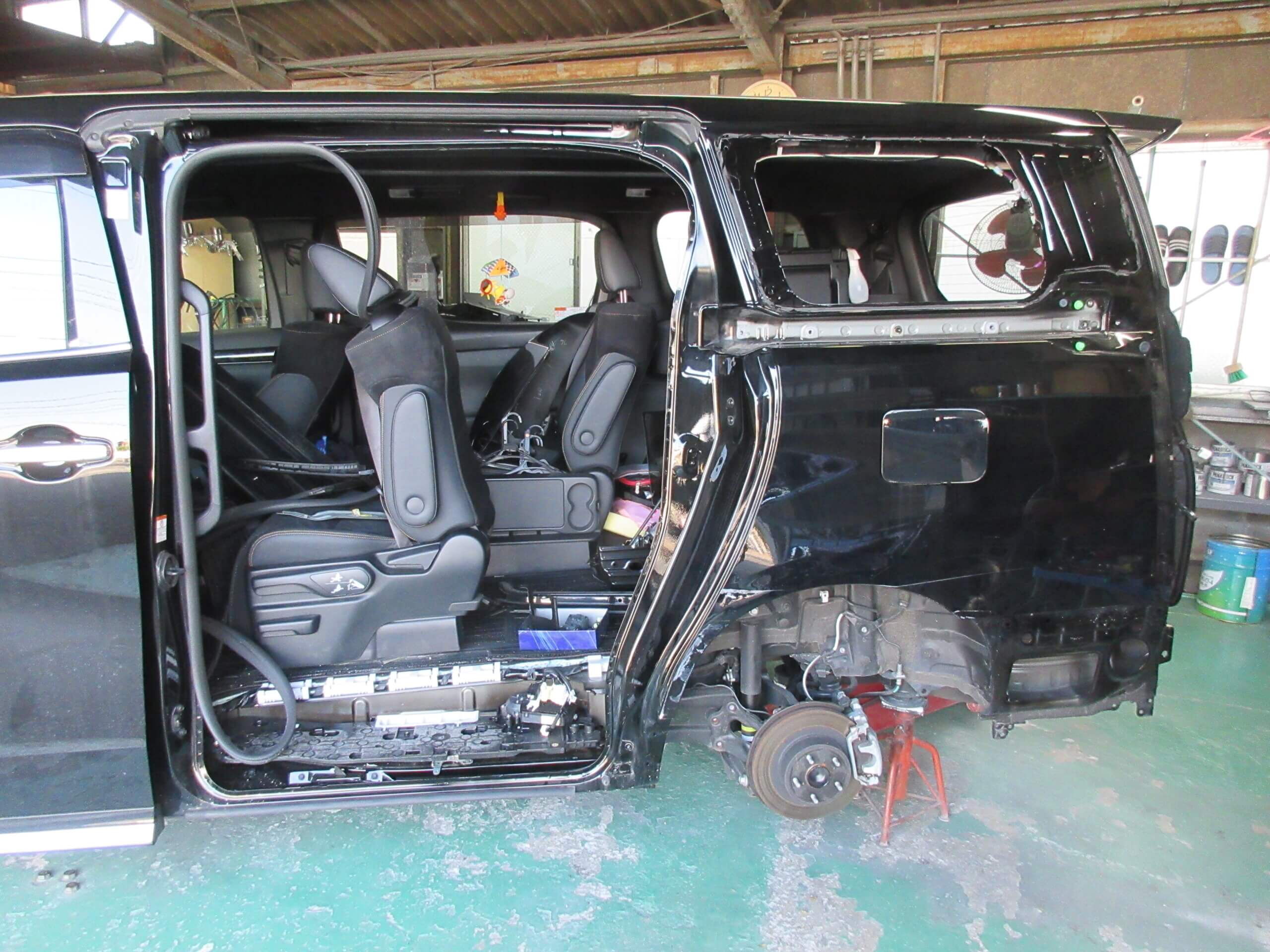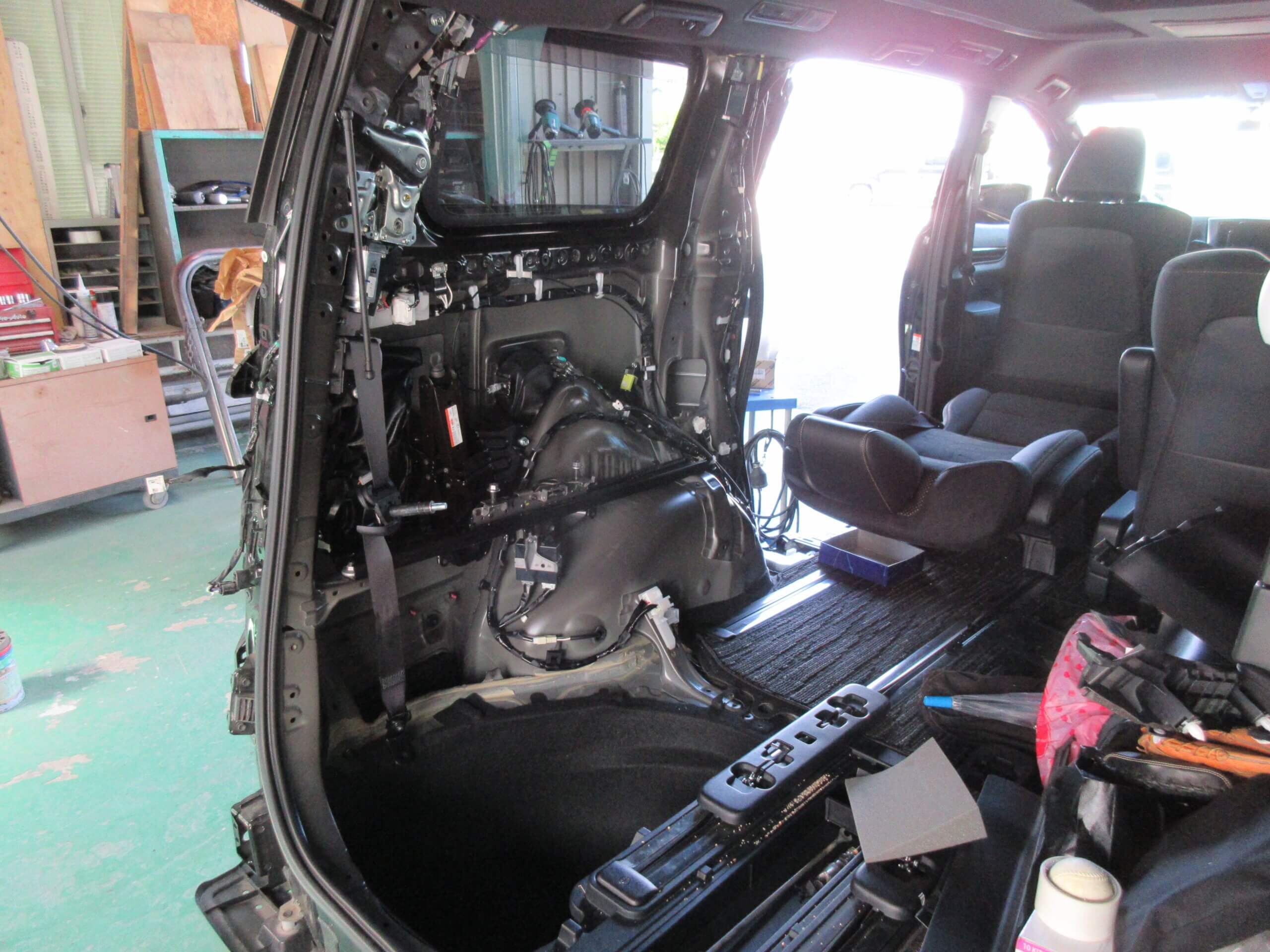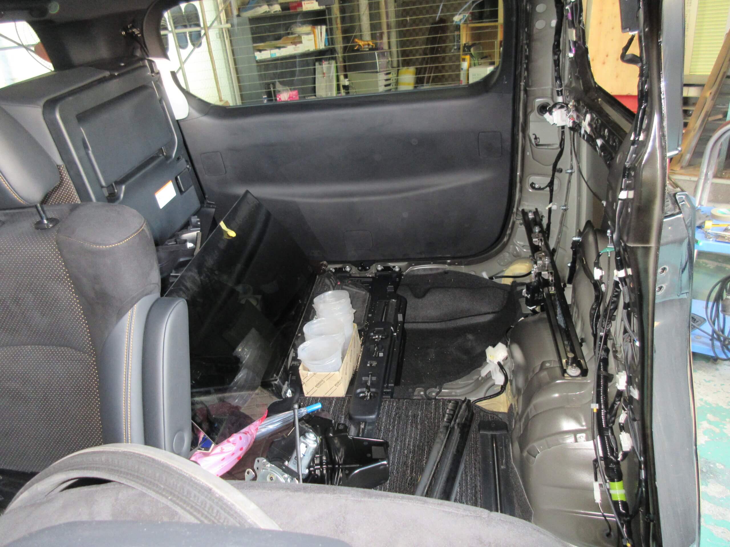 クォータパネルをカットするために座席と内張り等の室内の部品を外します。