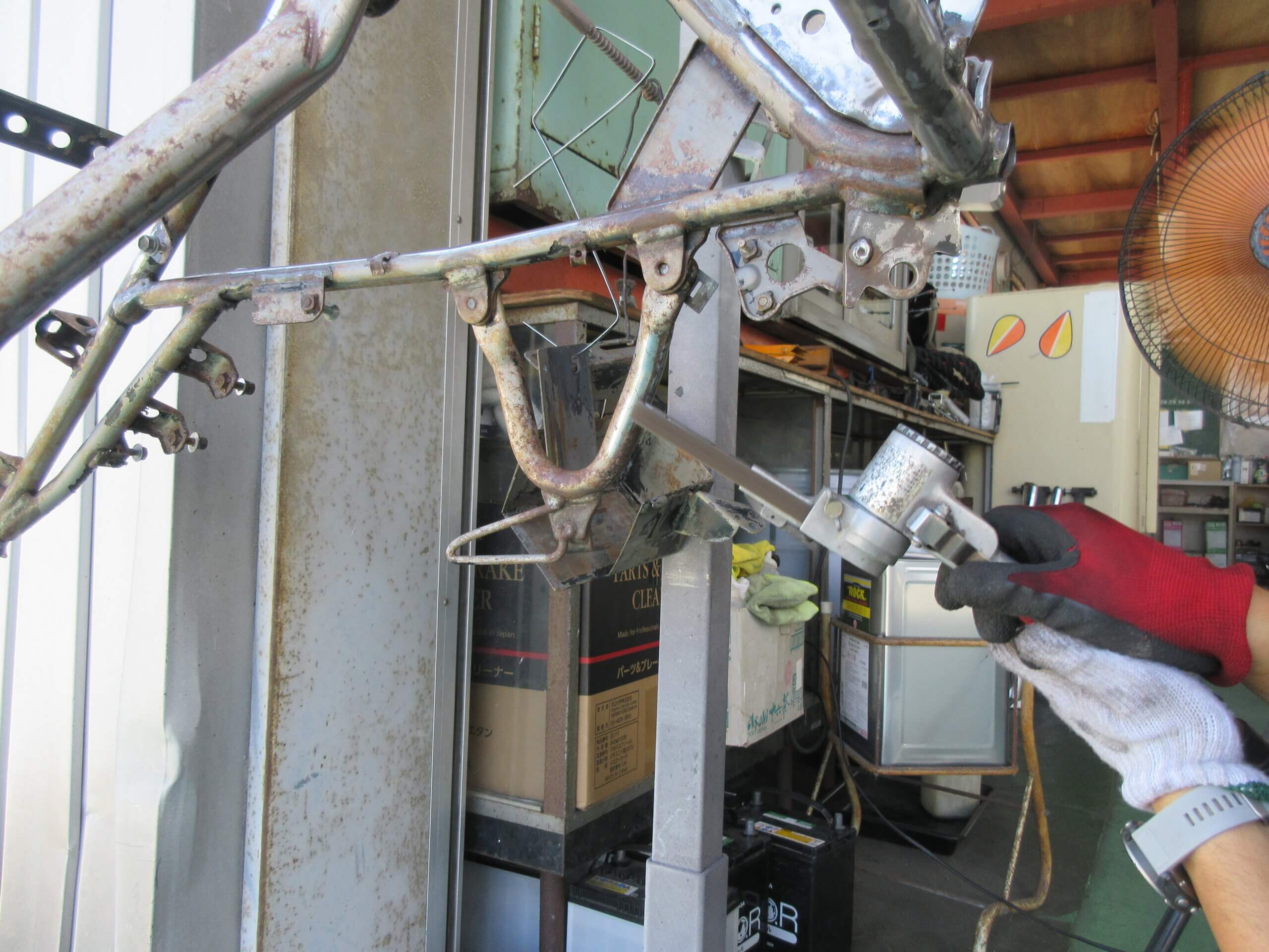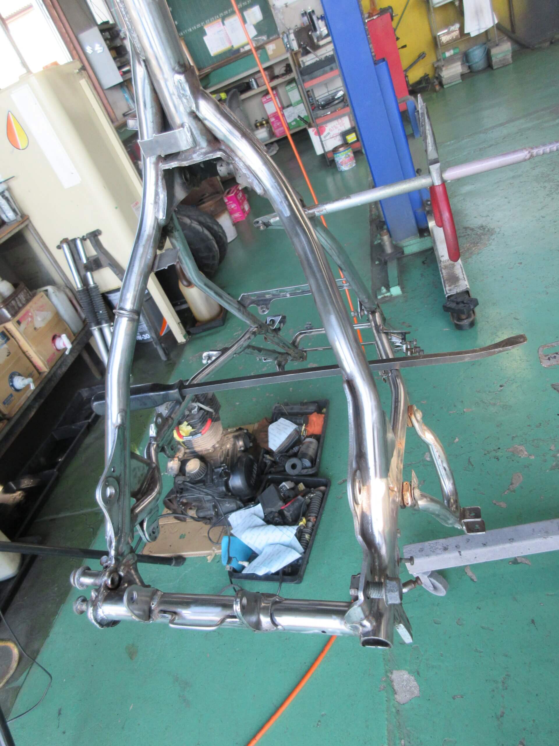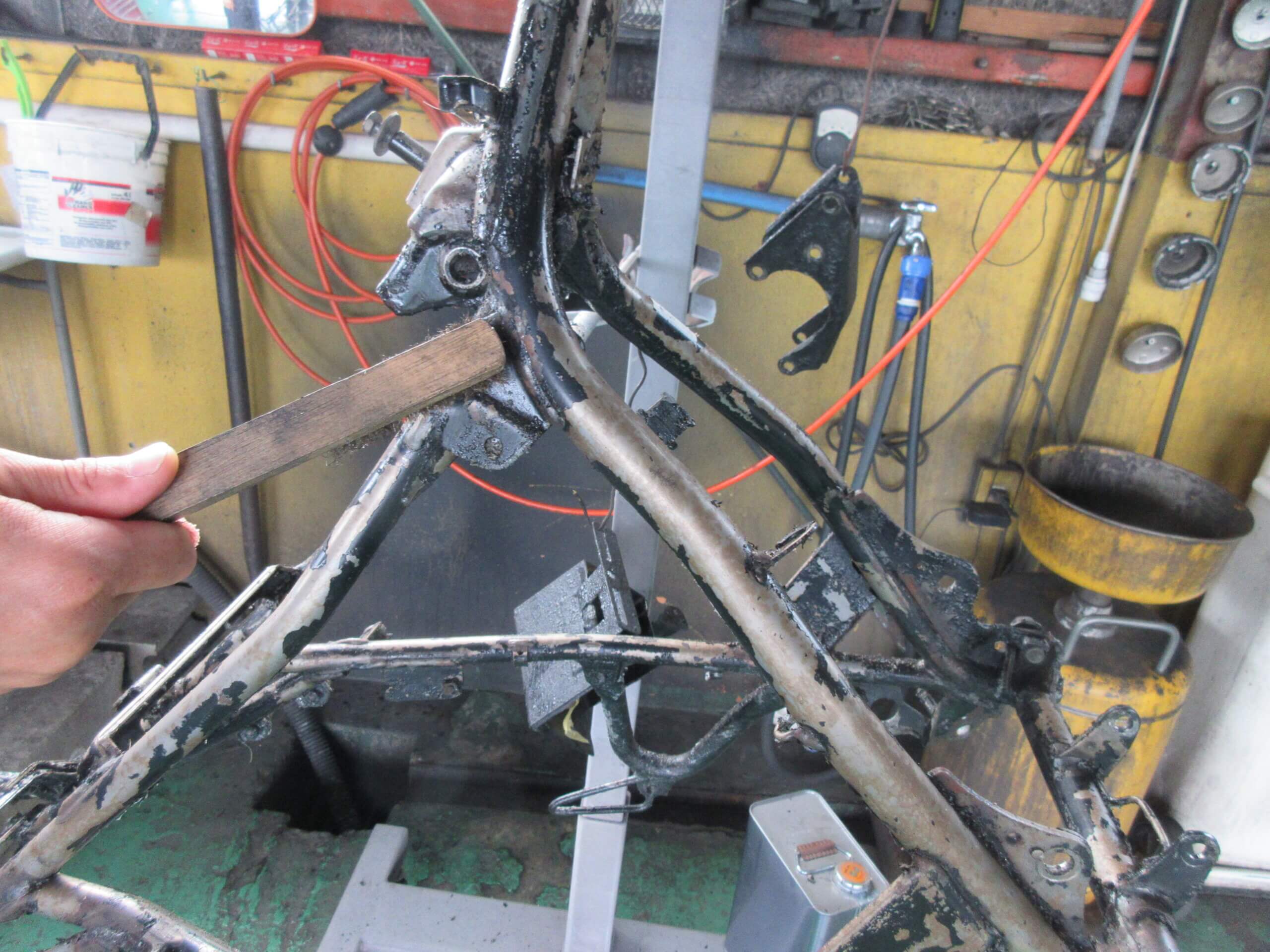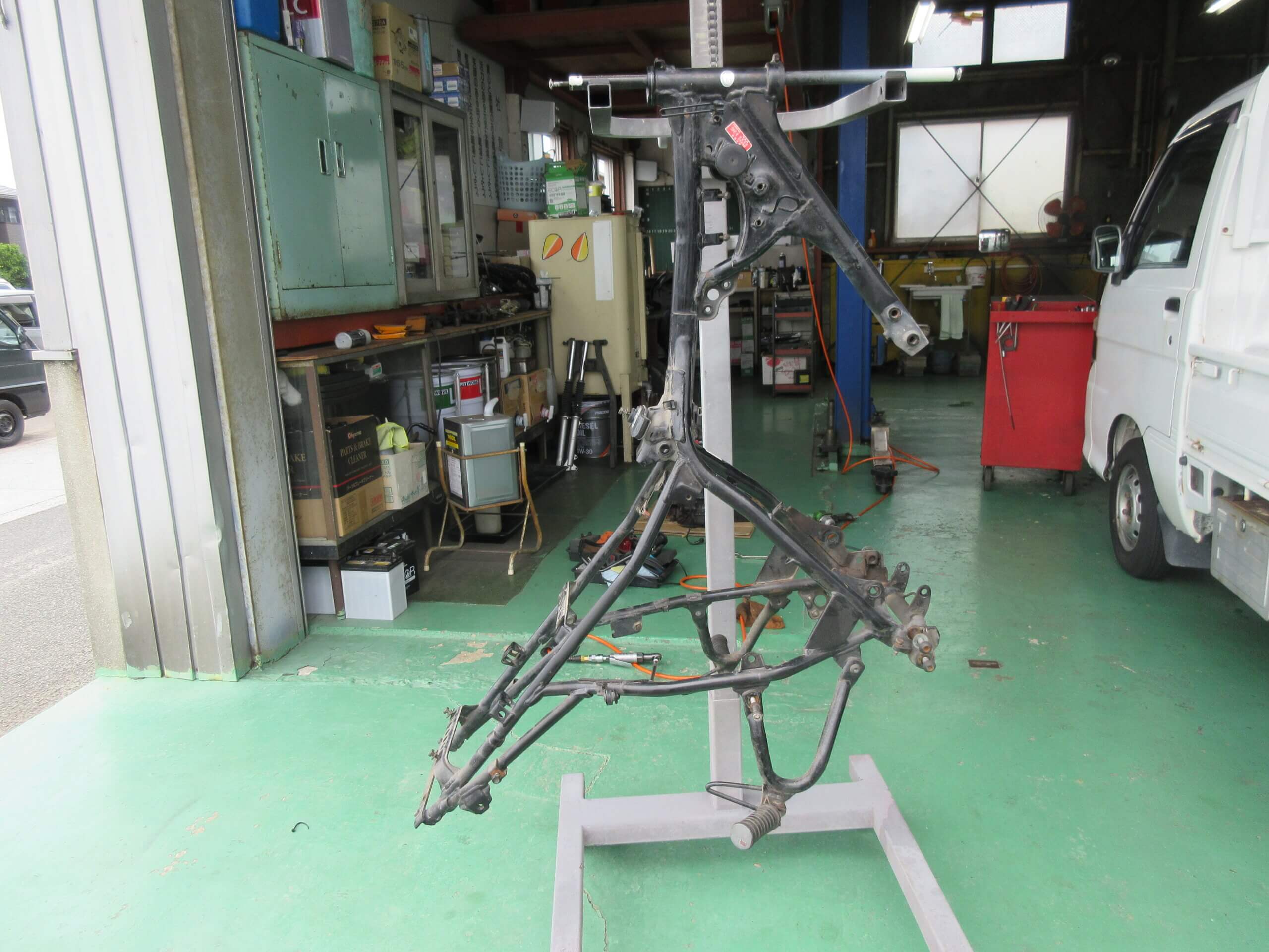 今回は、エンジンやタイヤを外してフレーム単体にして作業します。