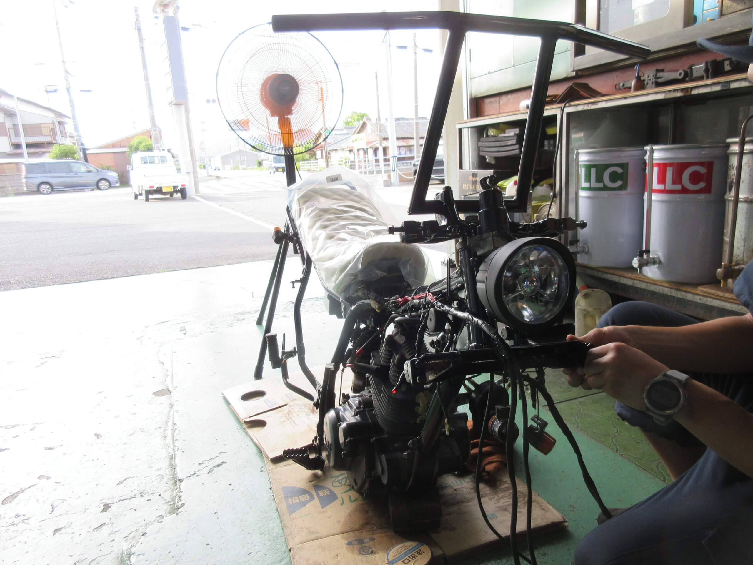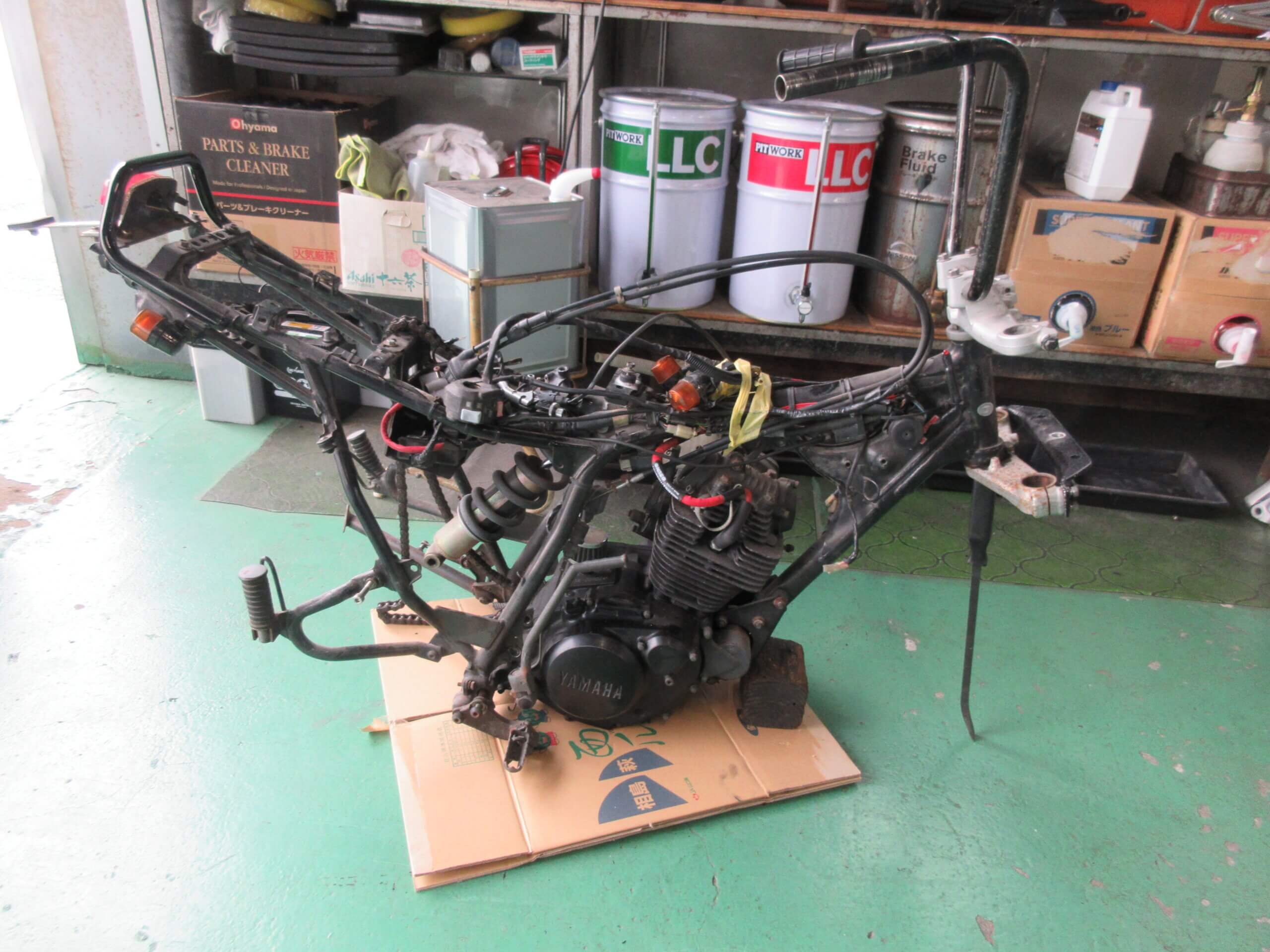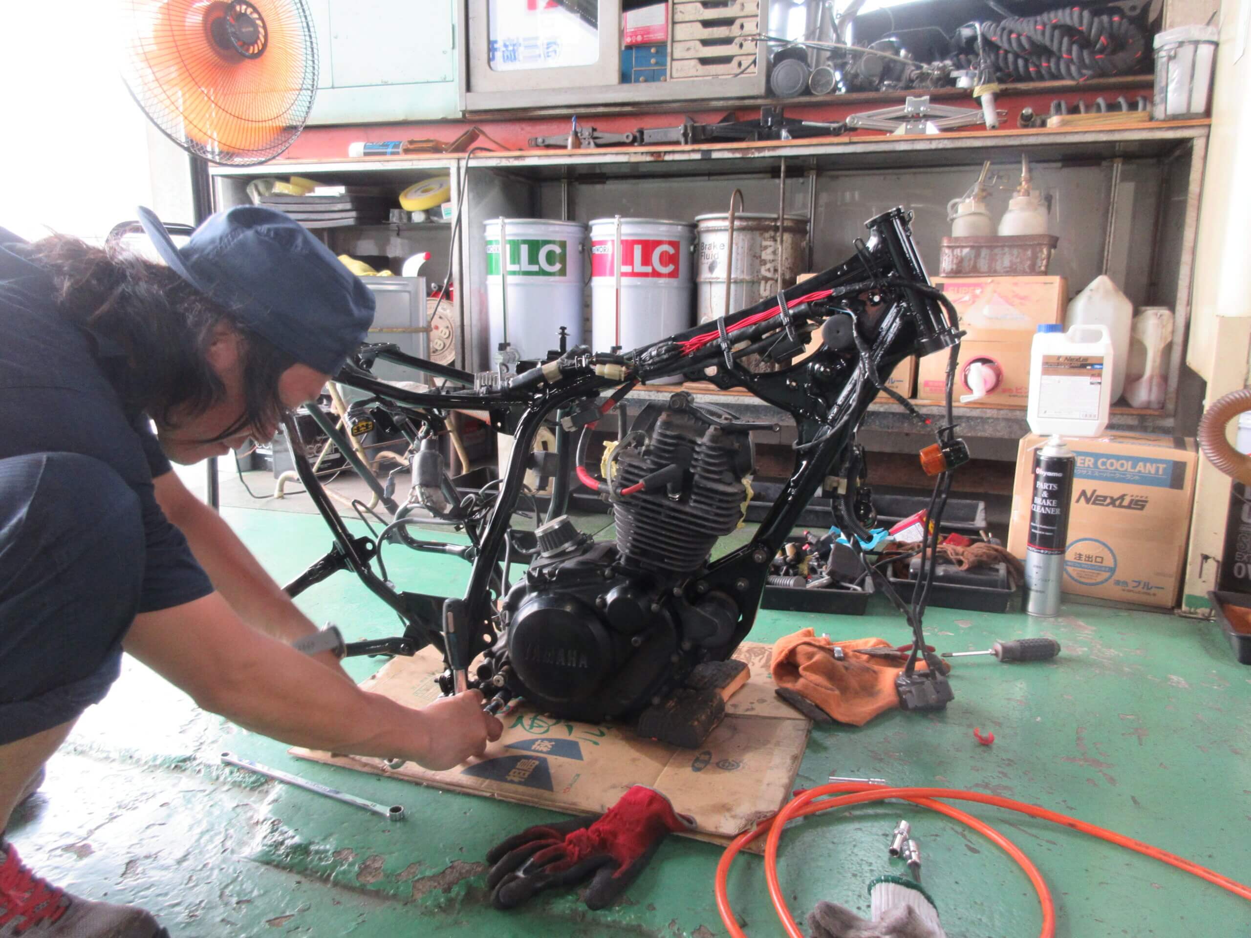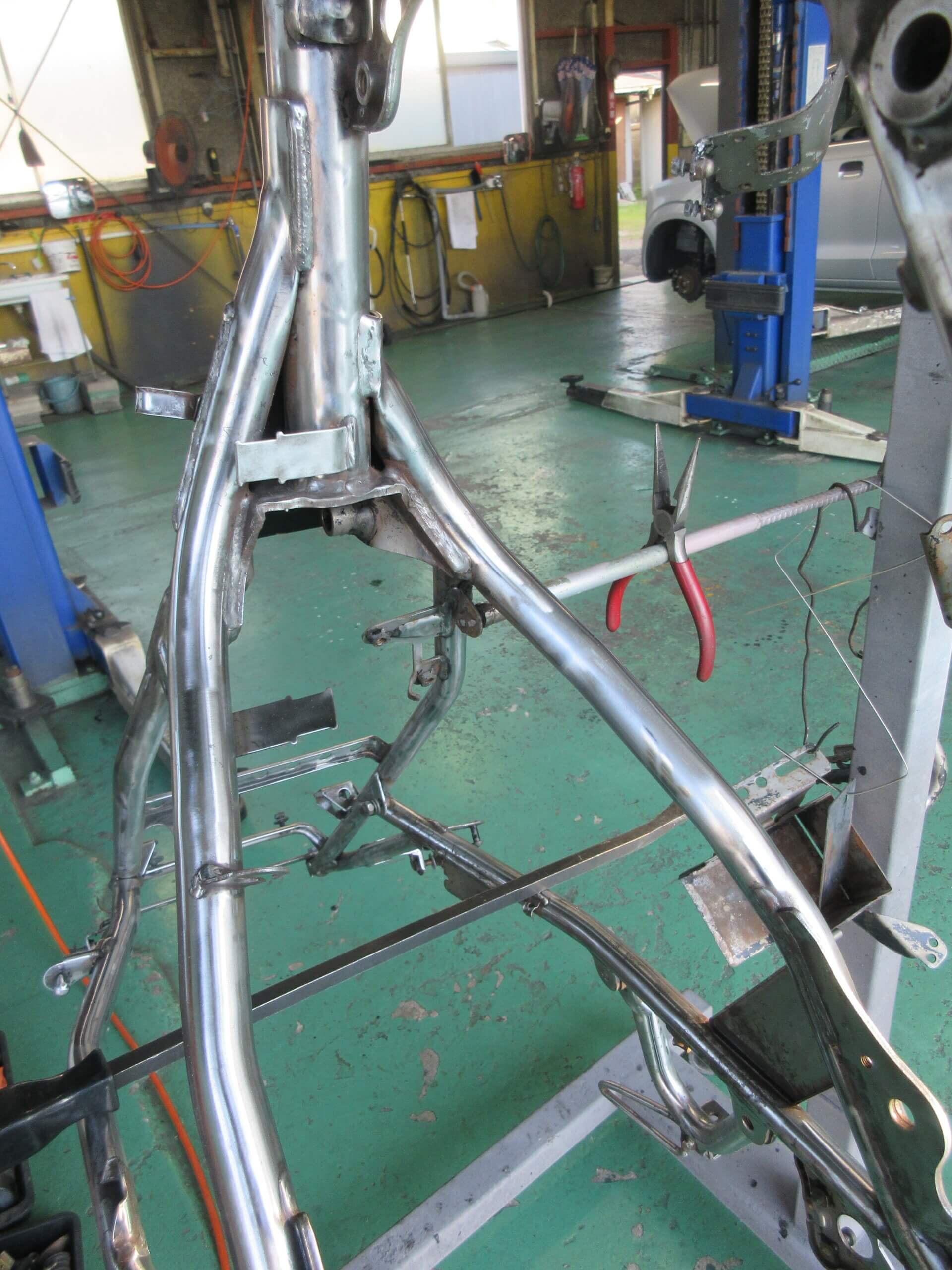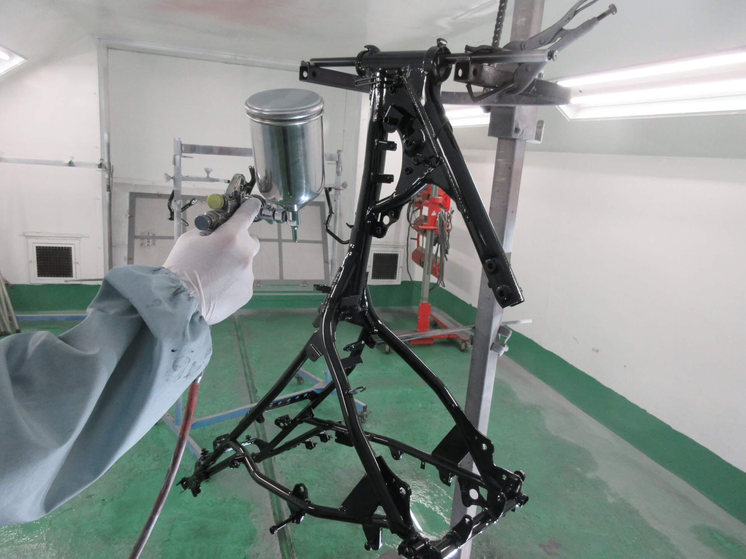 今回は、エンジンやタイヤを外してフレーム単体にして作業します。