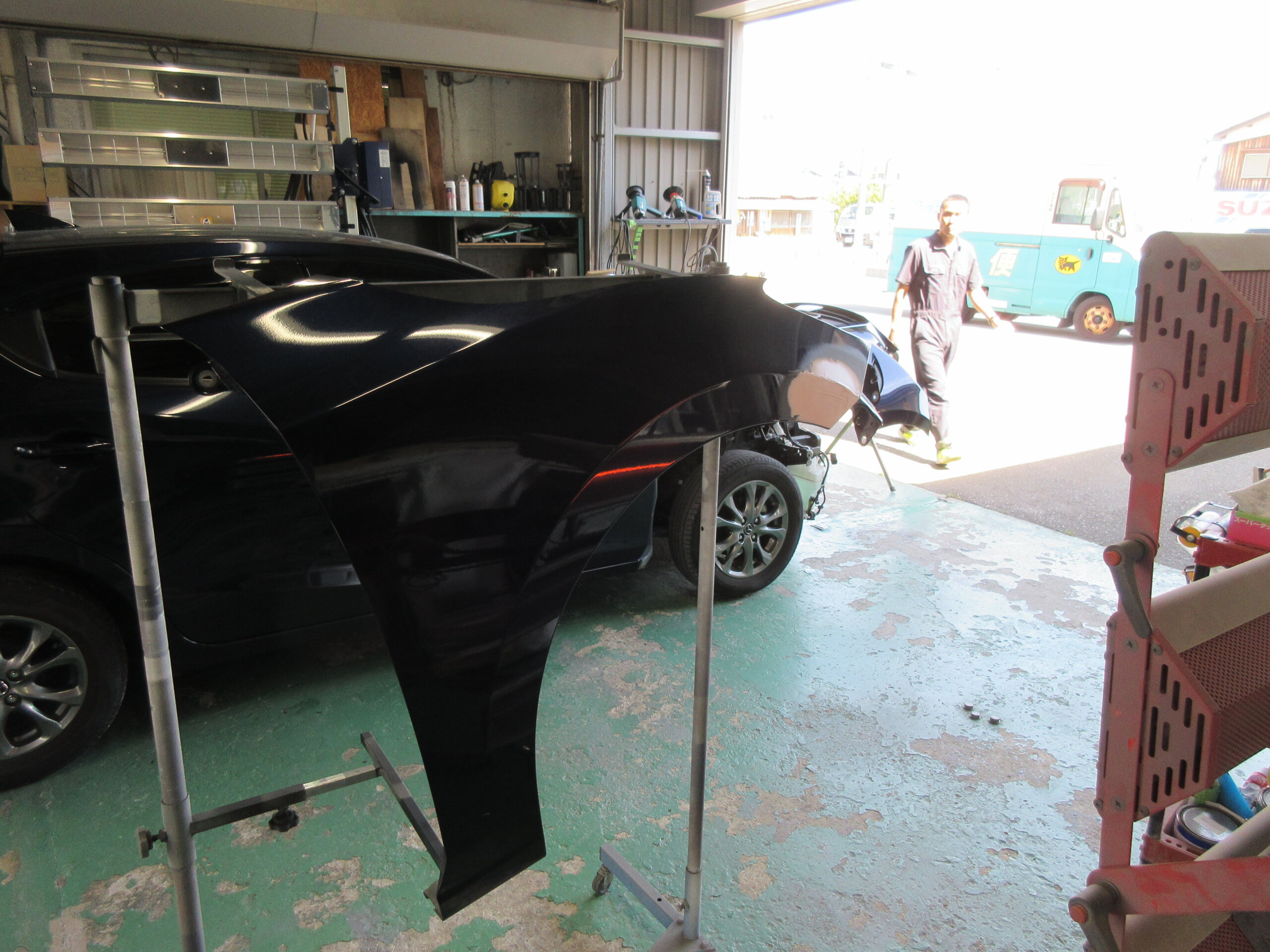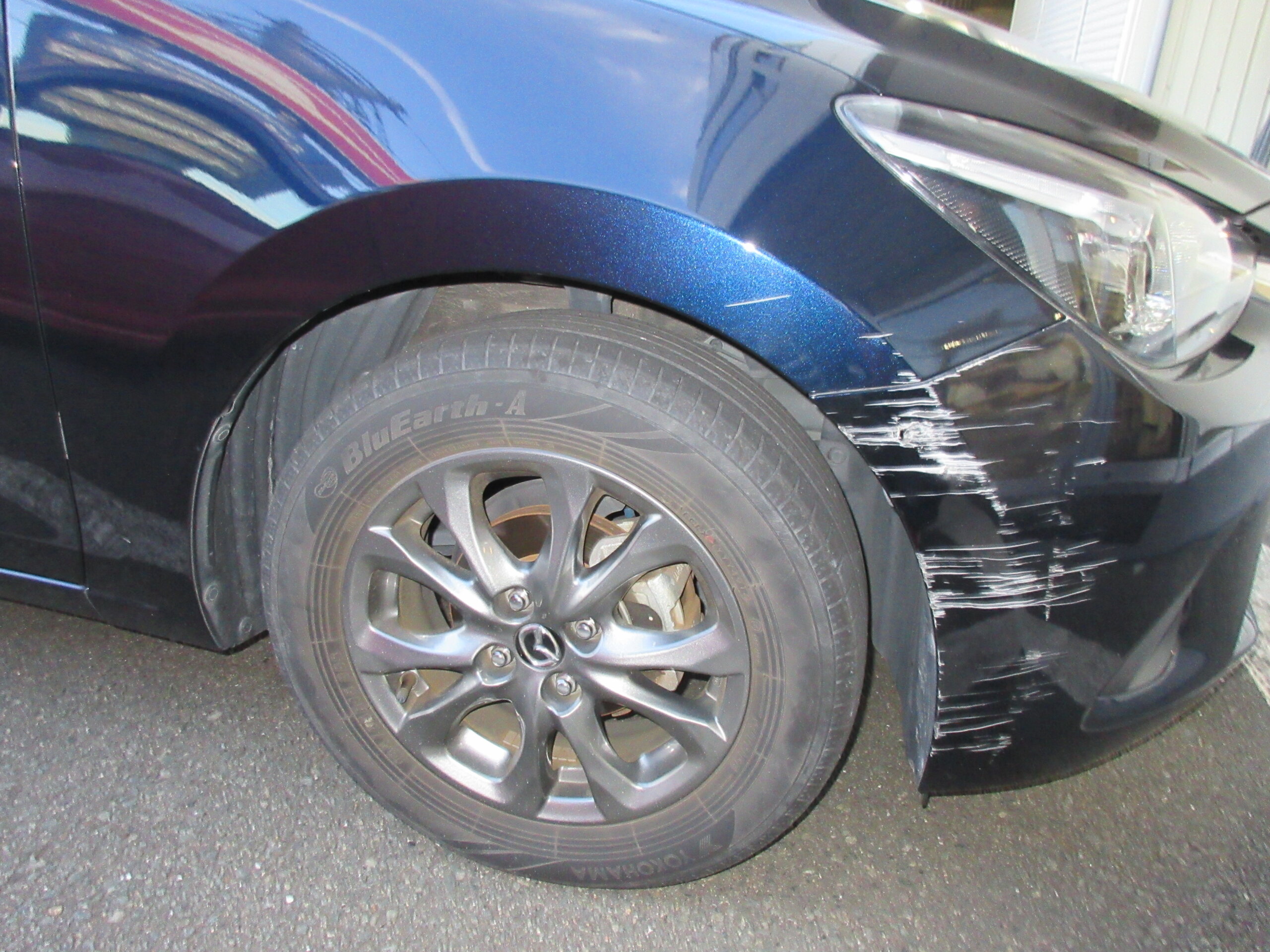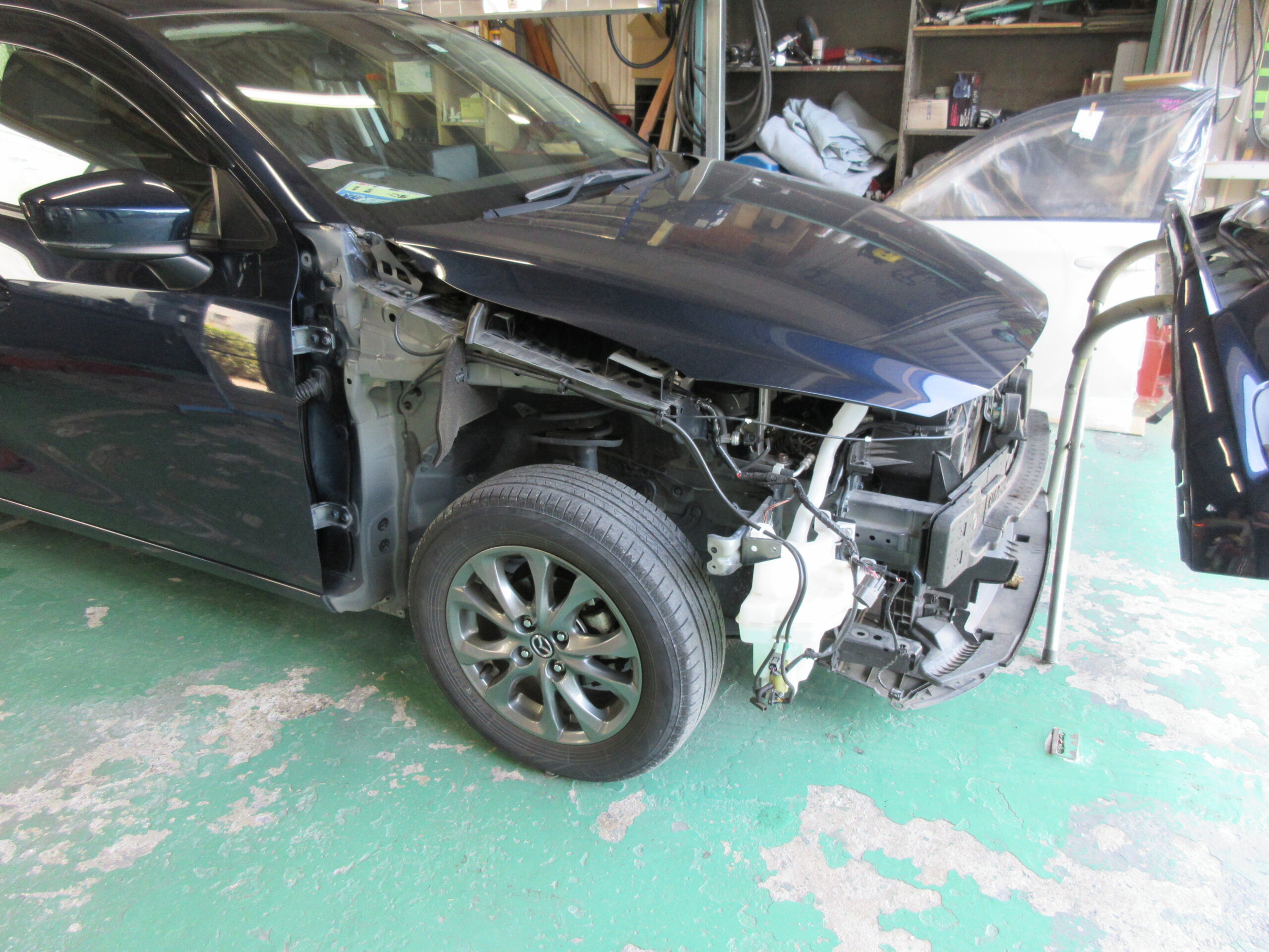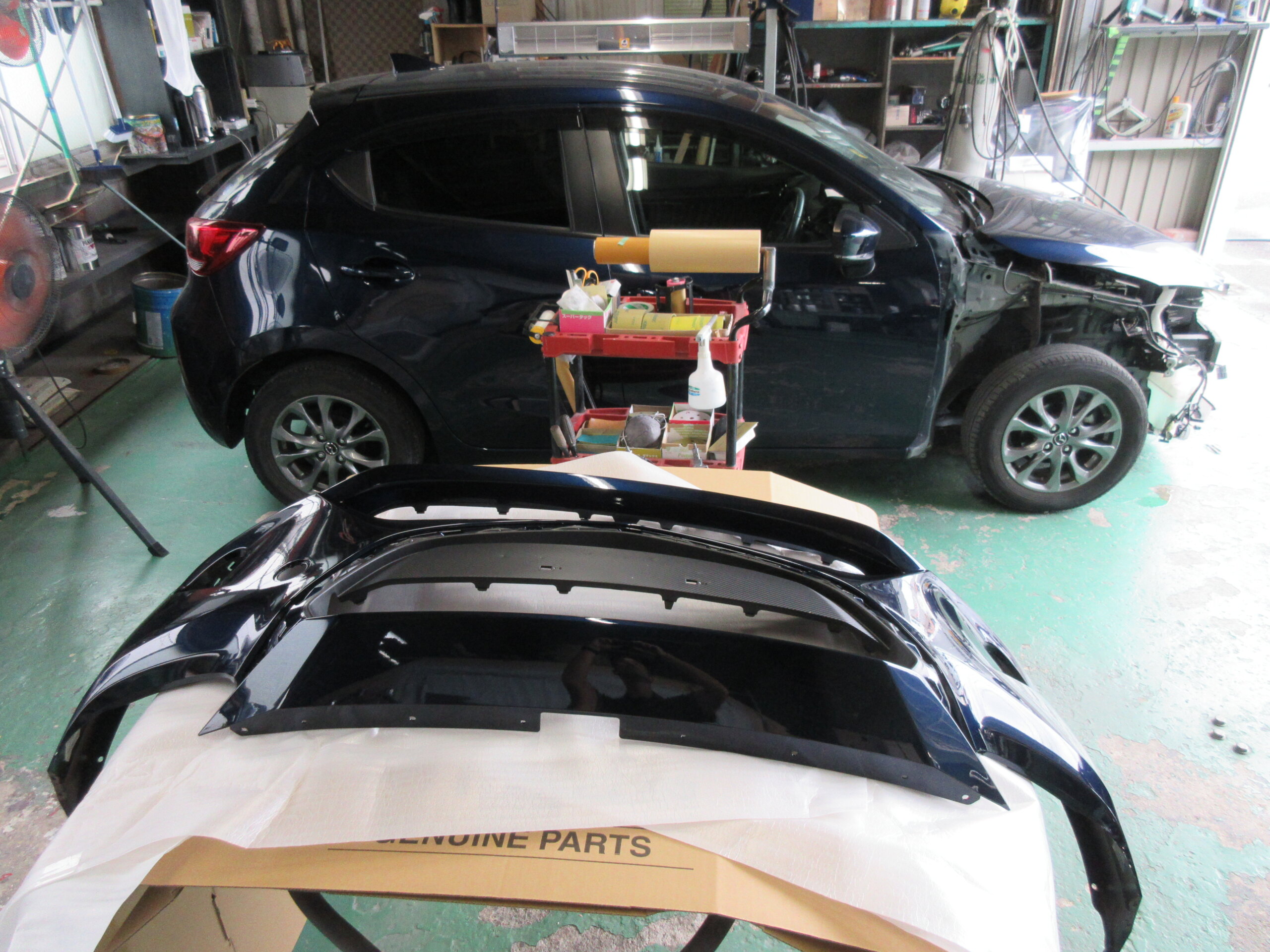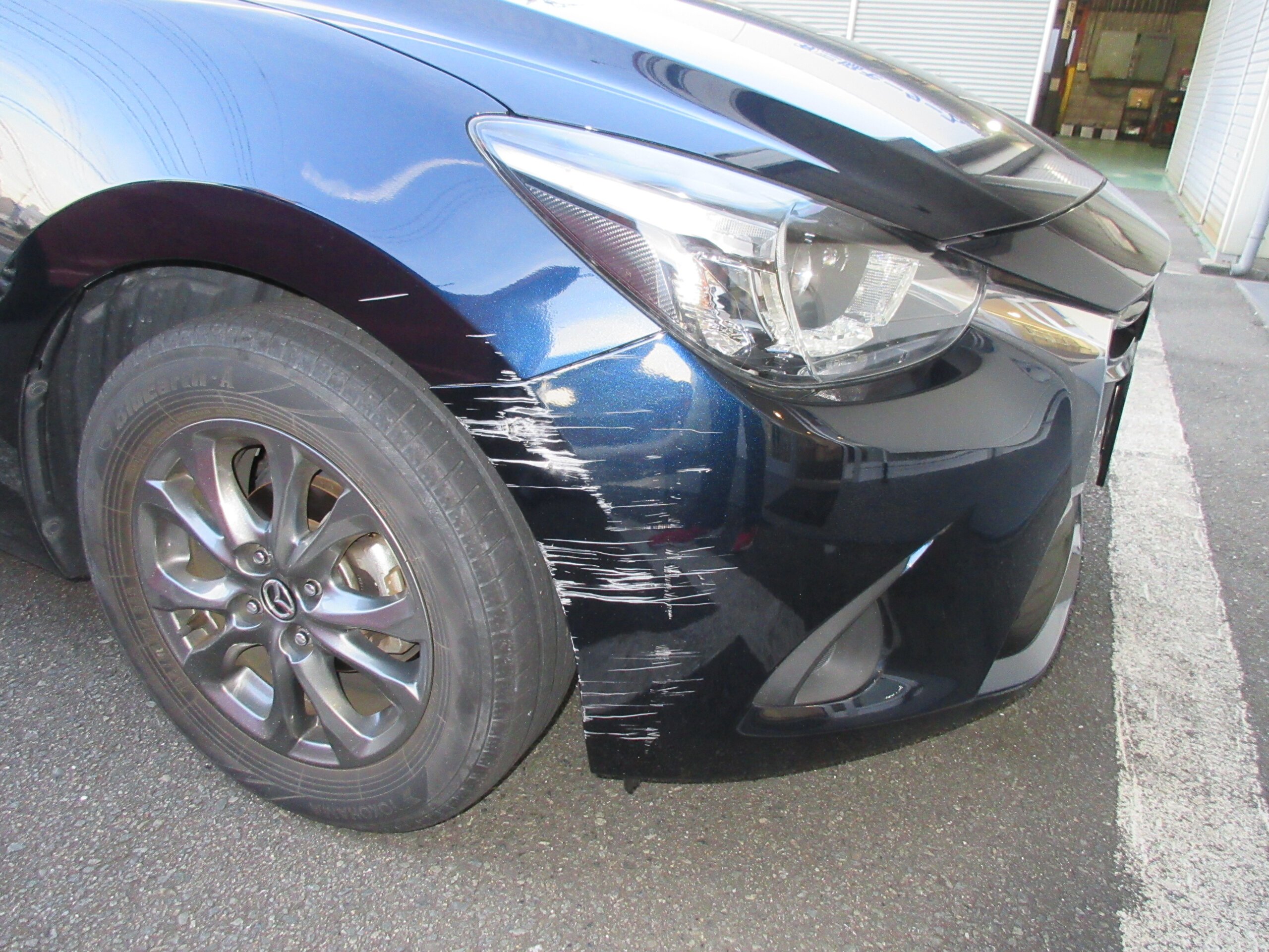 今回は、右フロントフェンダパネルの修理とフロントバンパ交換になります。