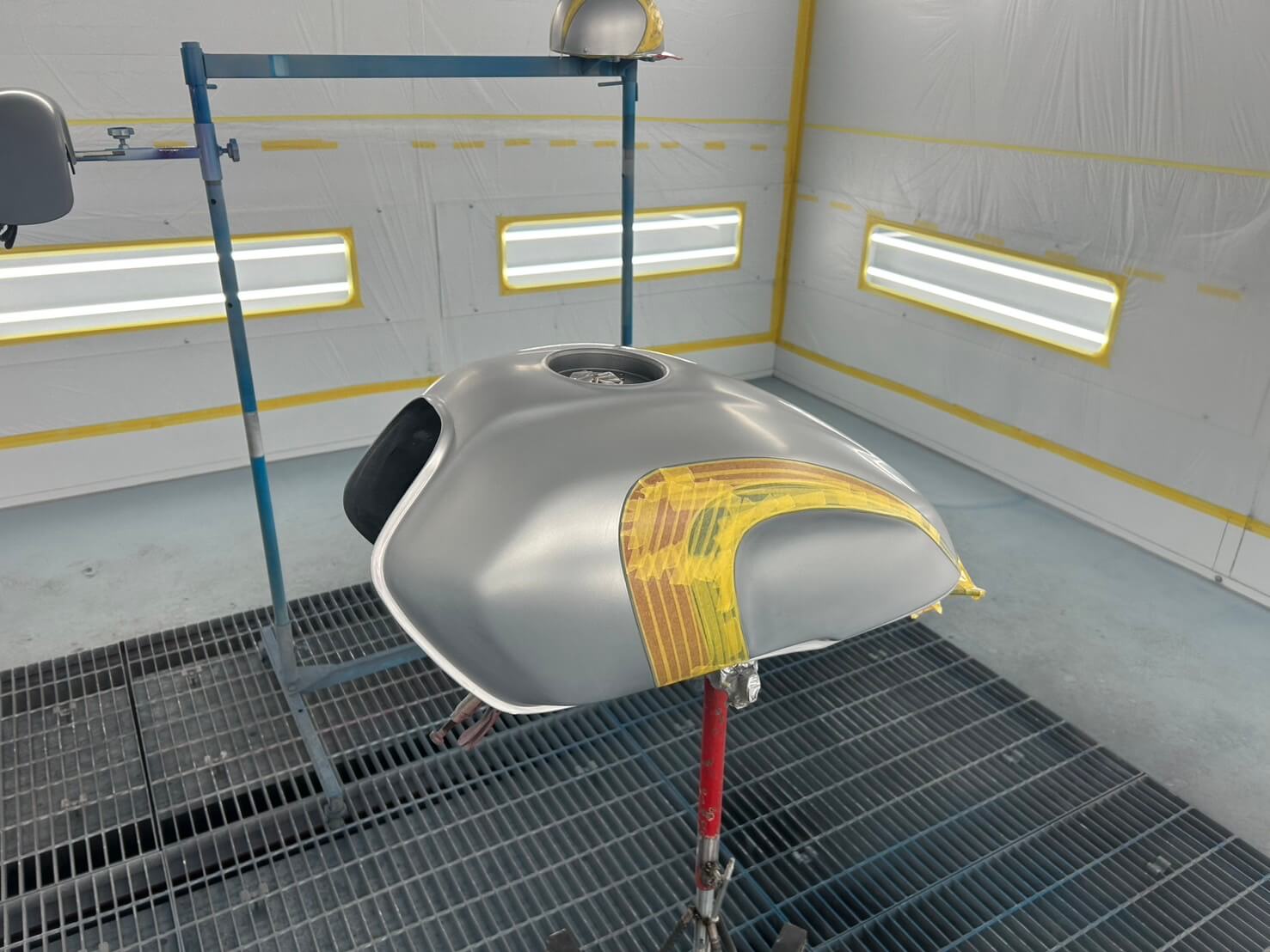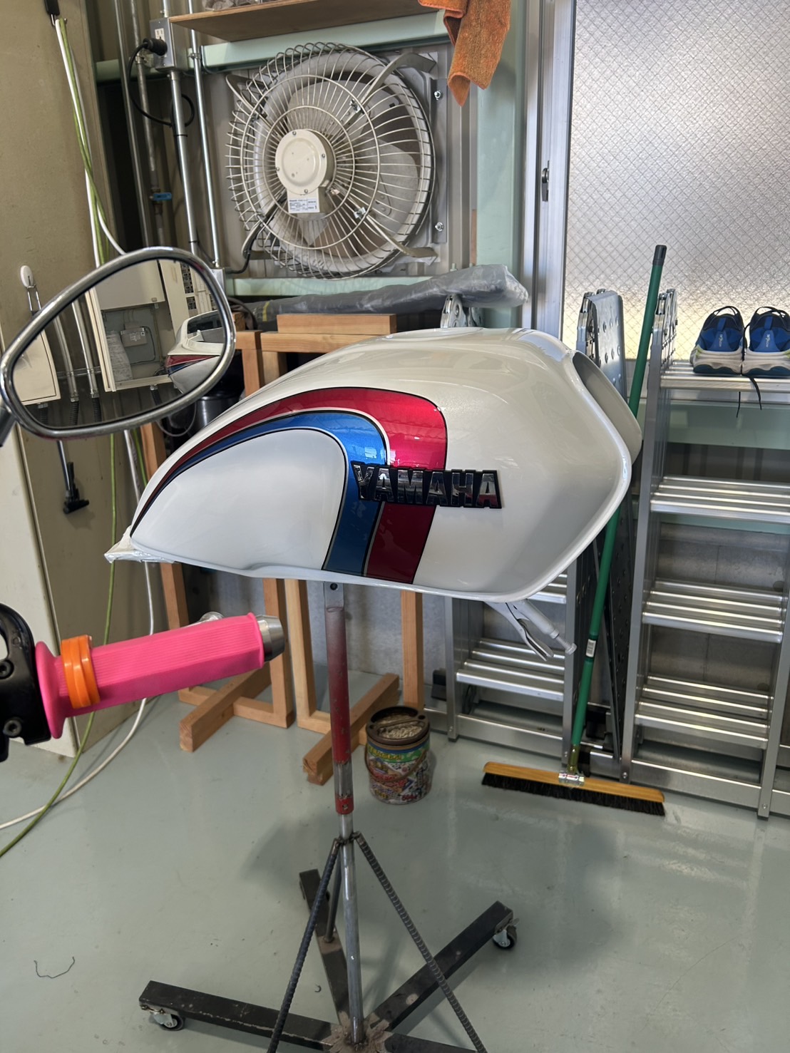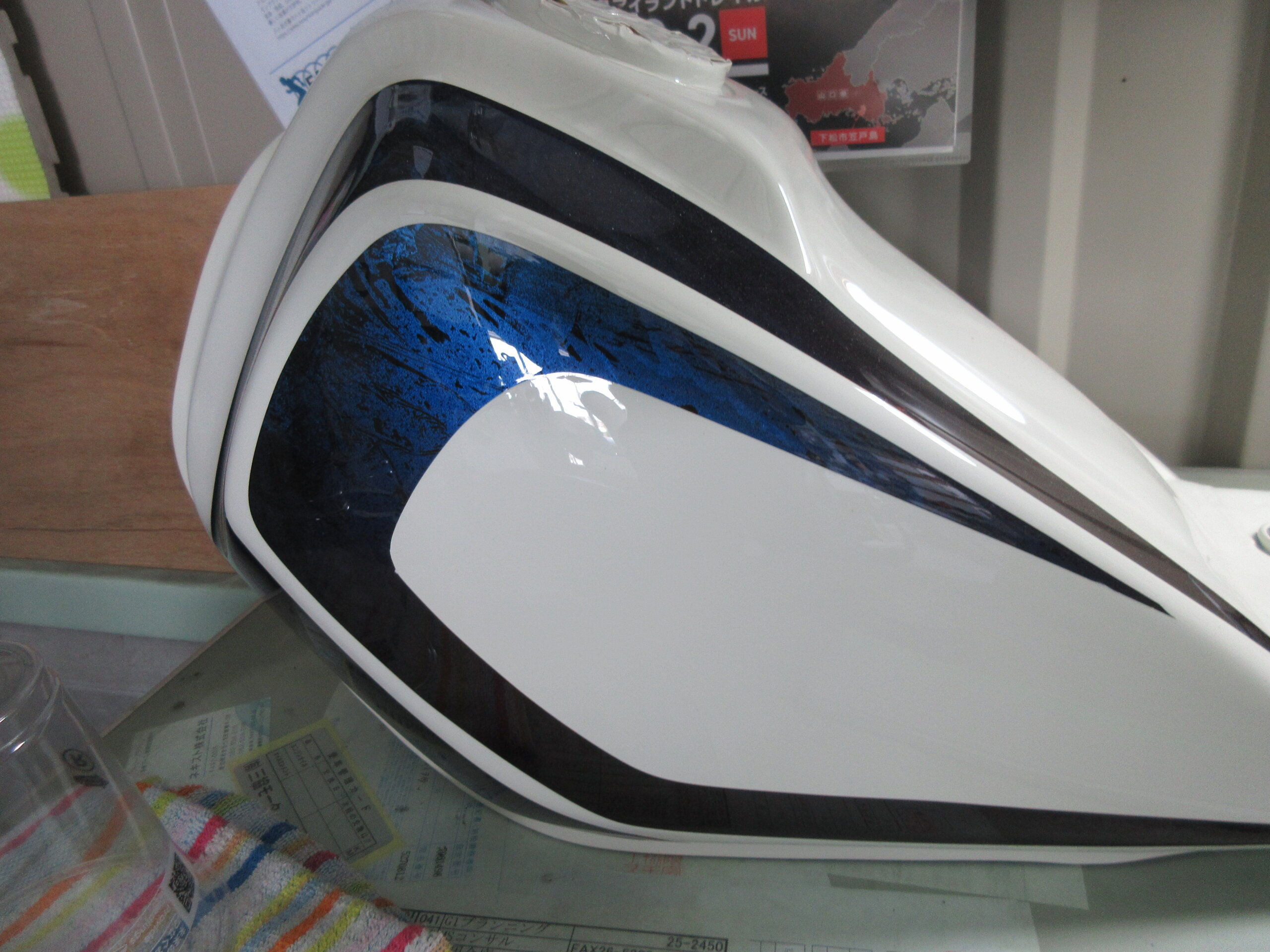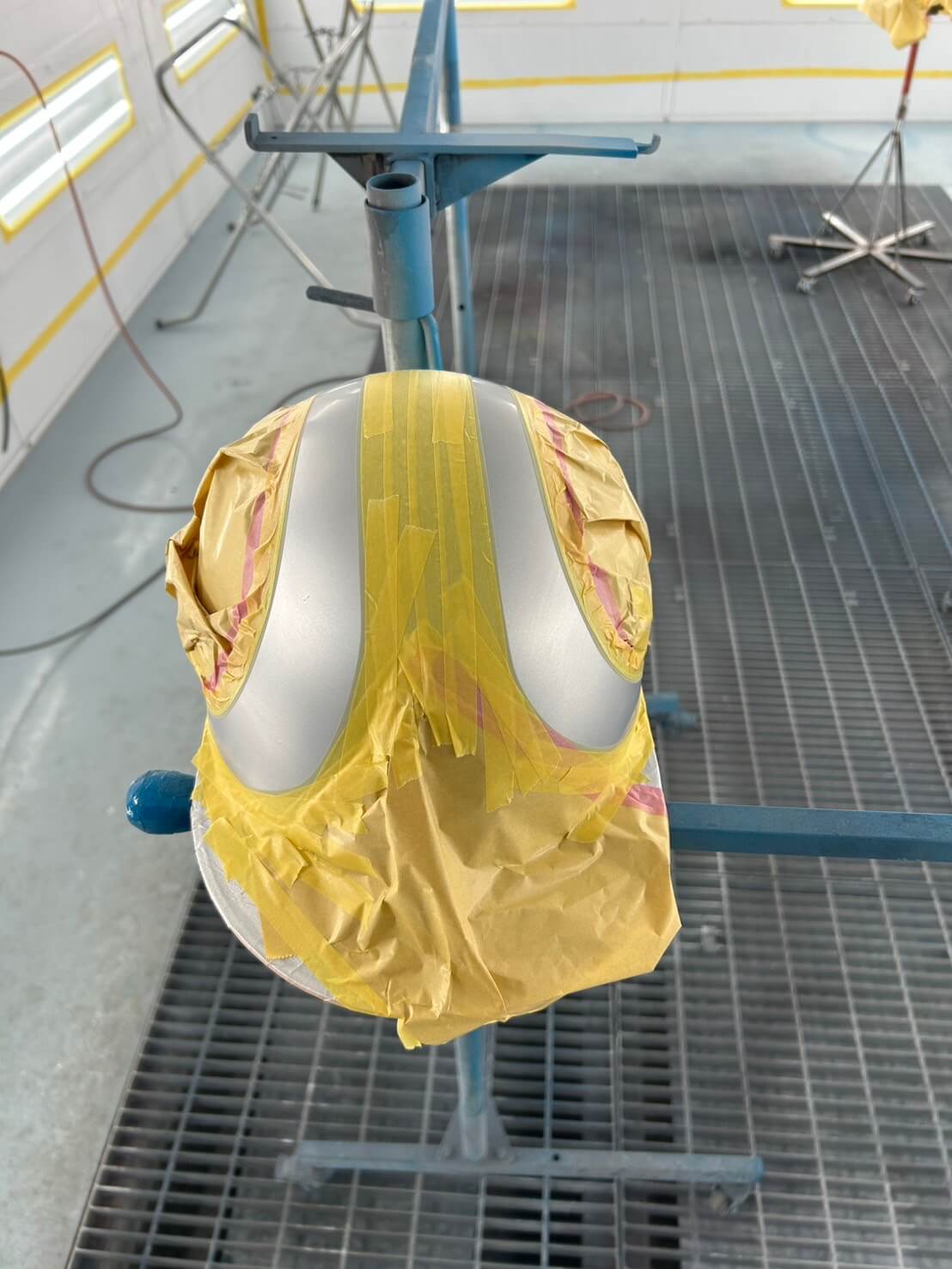 通常であれば白は、単色にするところを塗装工程が倍以上になるパールホワイトしたり、ライン部をデカール(ステッカー)で貼って済ましてしまいますがご用命によりライン部も塗装施工することになりました。