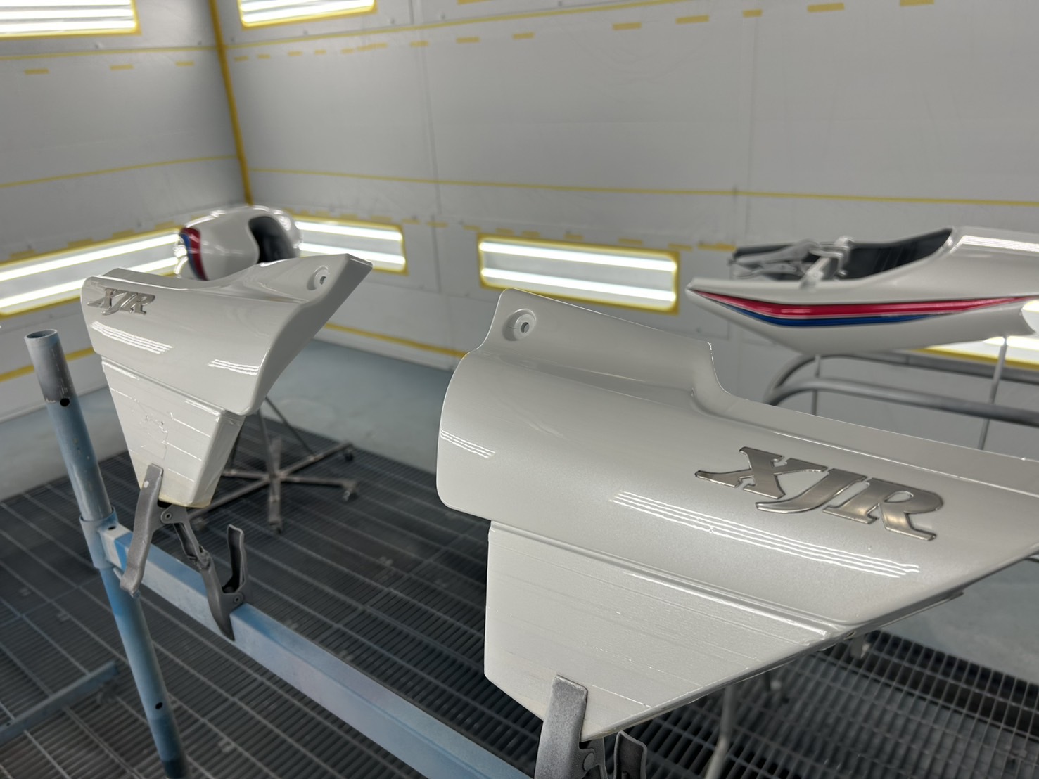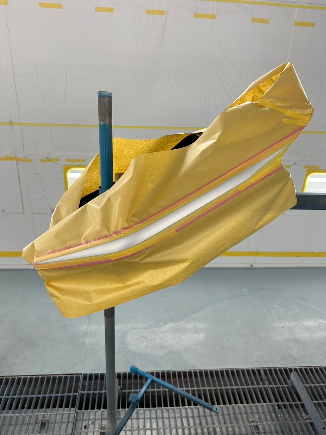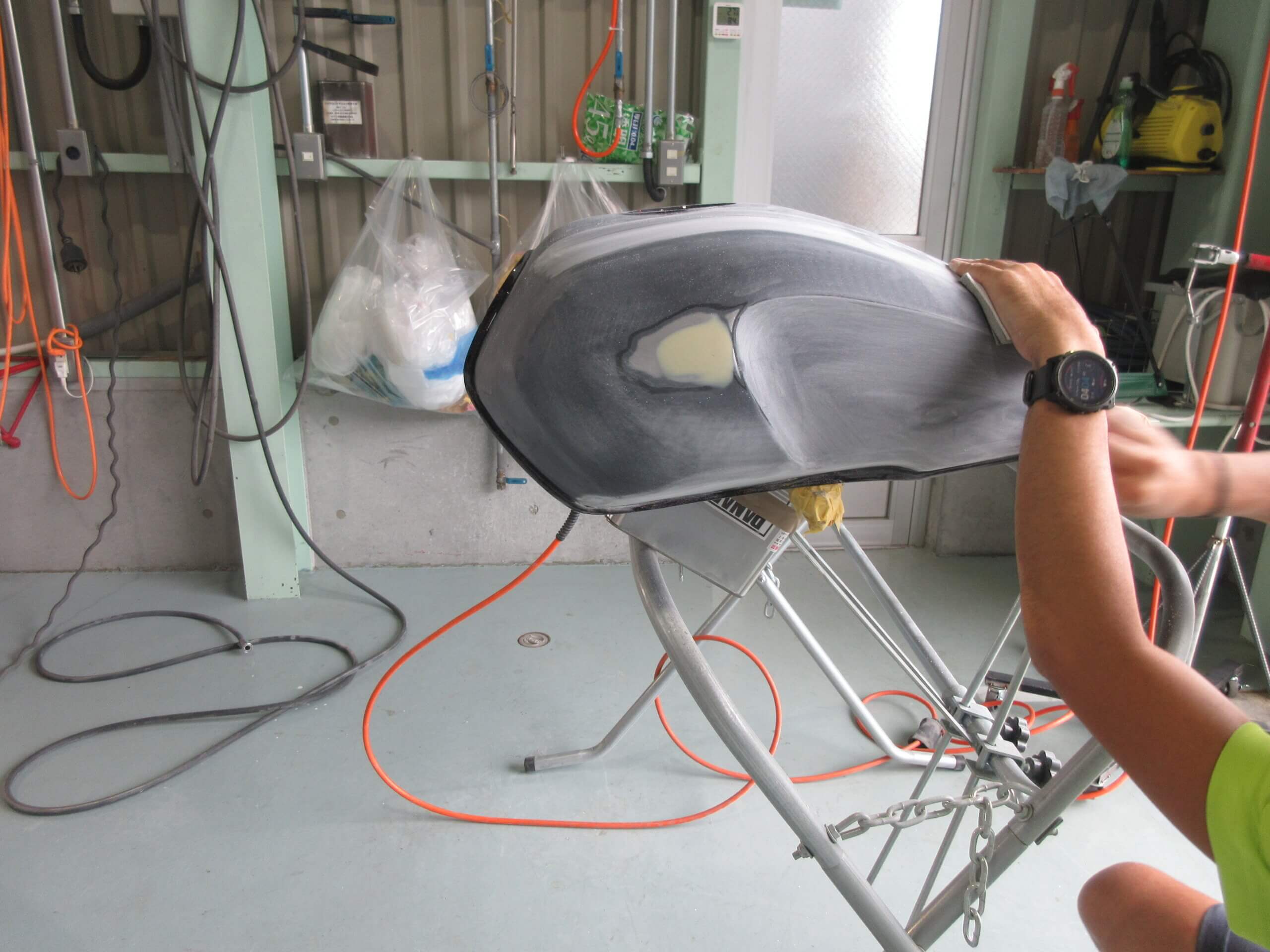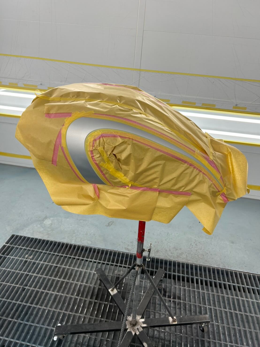 通常であれば白は、単色にするところを塗装工程が倍以上になるパールホワイトしたり、ライン部をデカール(ステッカー)で貼って済ましてしまいますがご用命によりライン部も塗装施工することになりました。