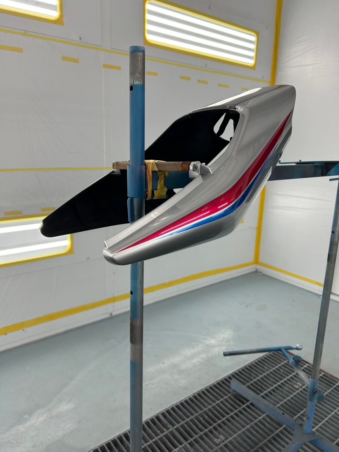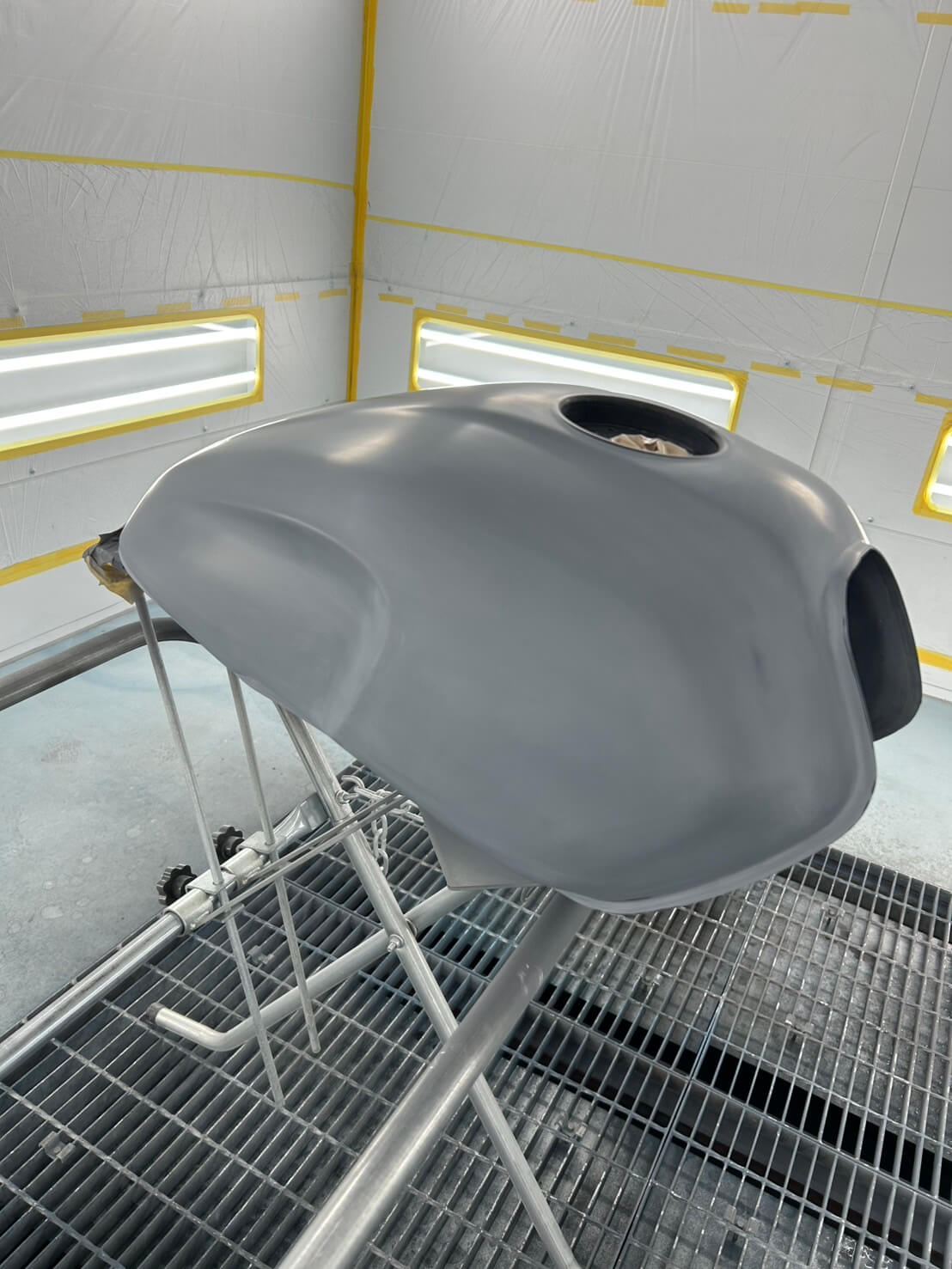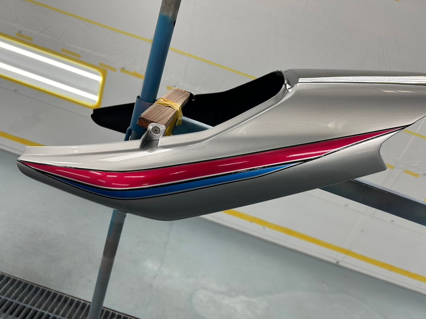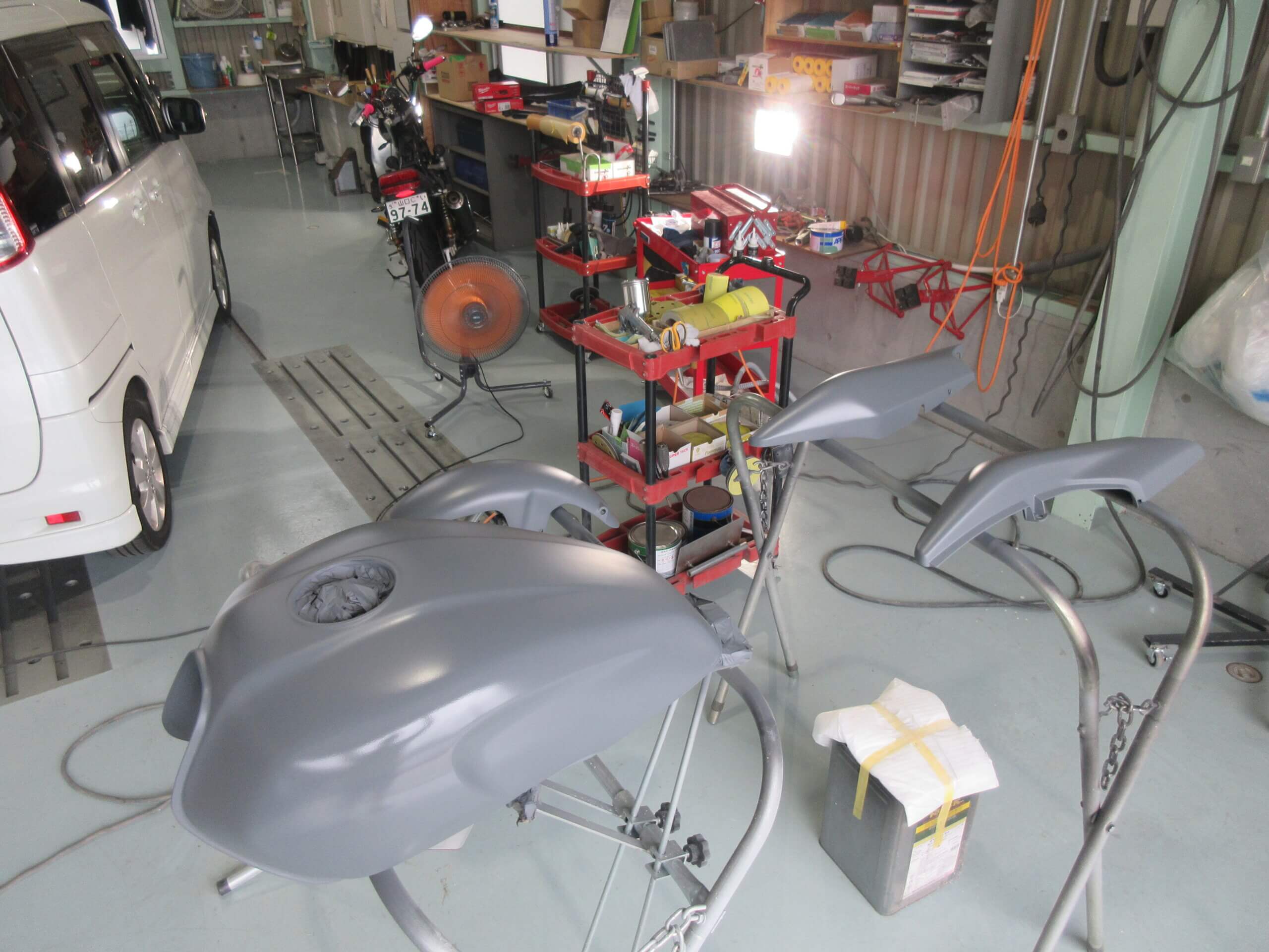 通常であれば白は、単色にするところを塗装工程が倍以上になるパールホワイトしたり、ライン部をデカール(ステッカー)で貼って済ましてしまいますがご用命によりライン部も塗装施工することになりました。