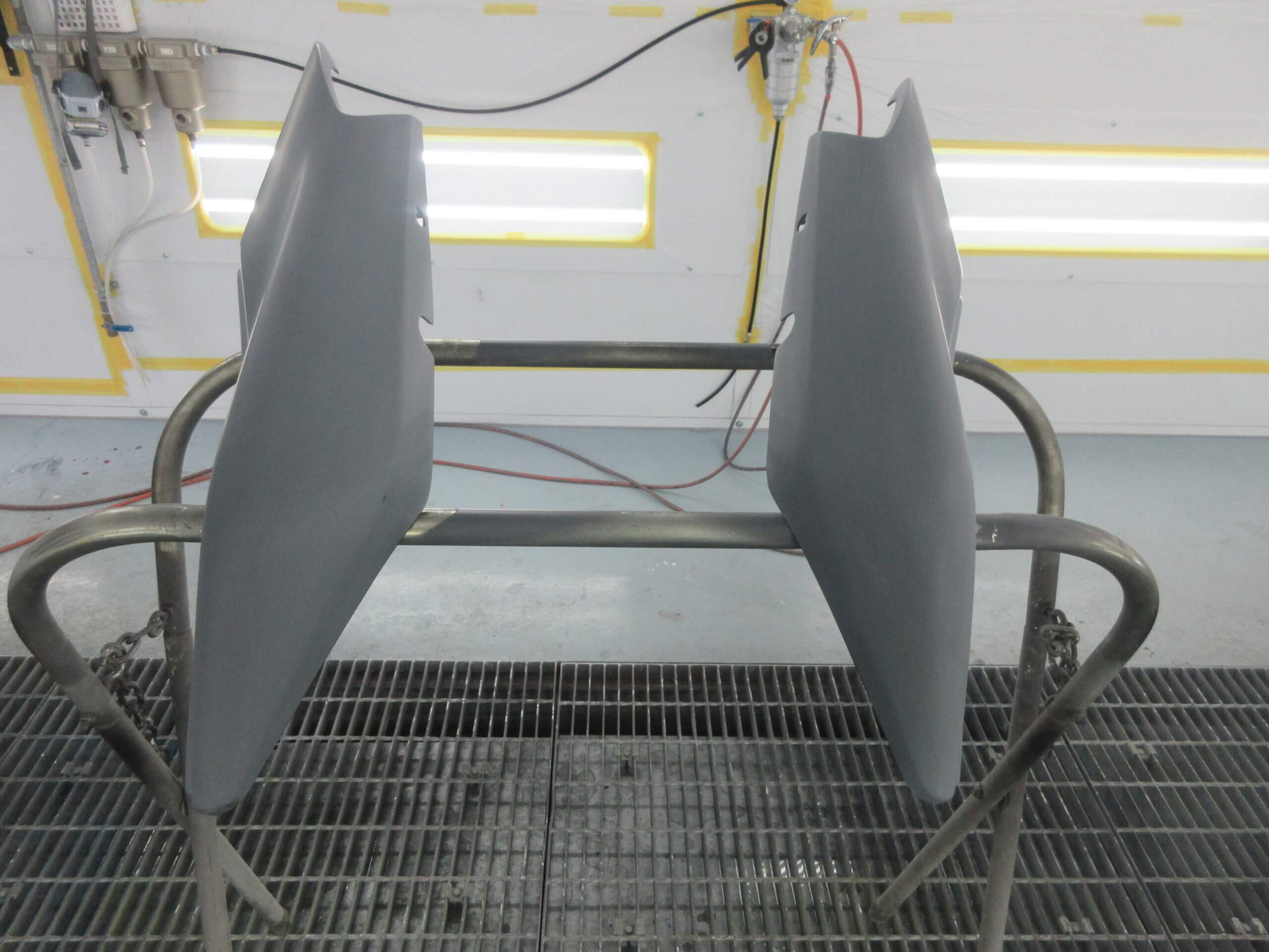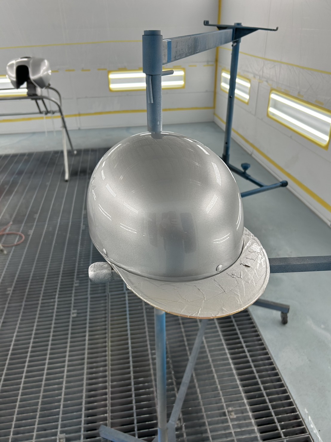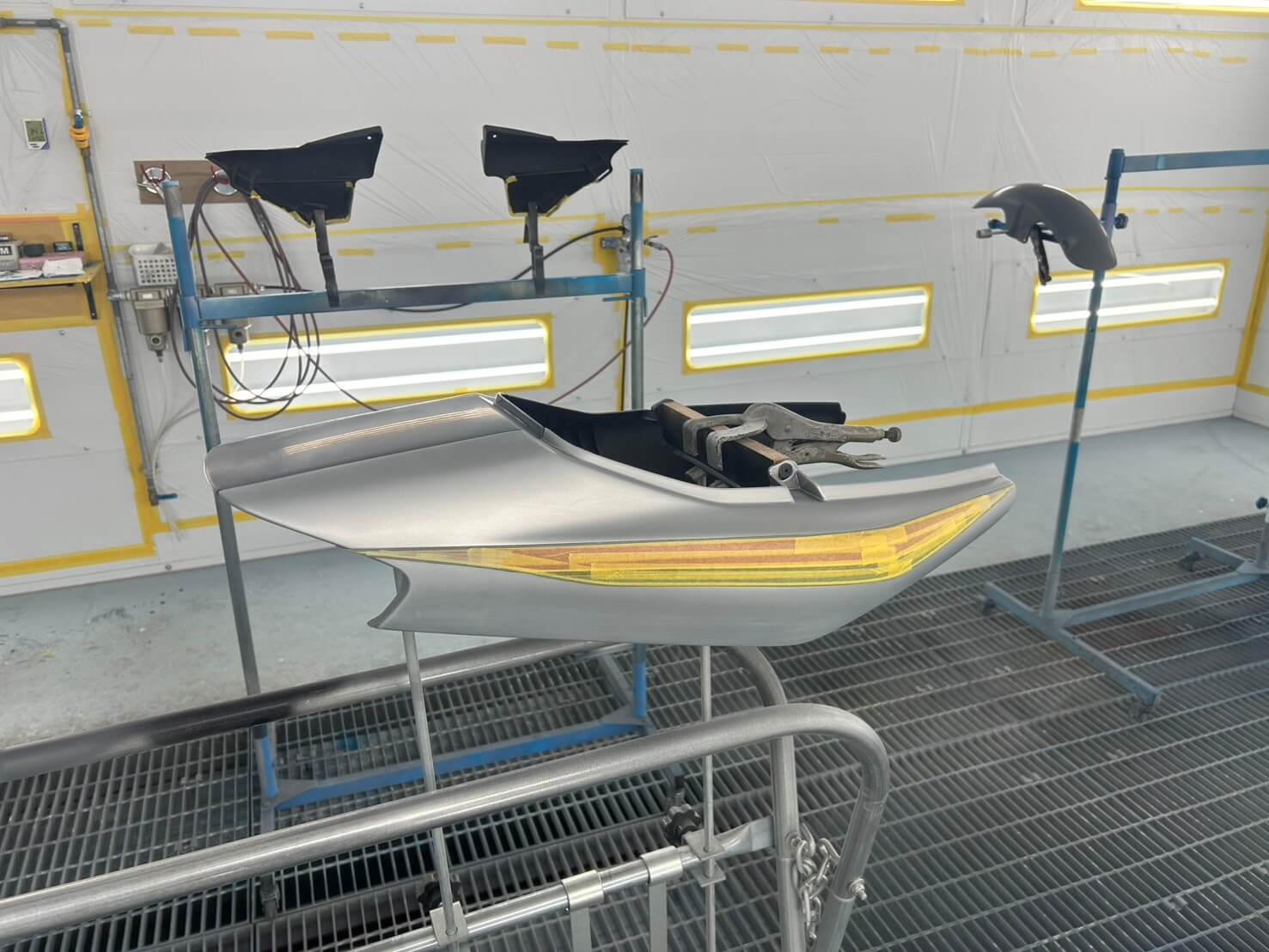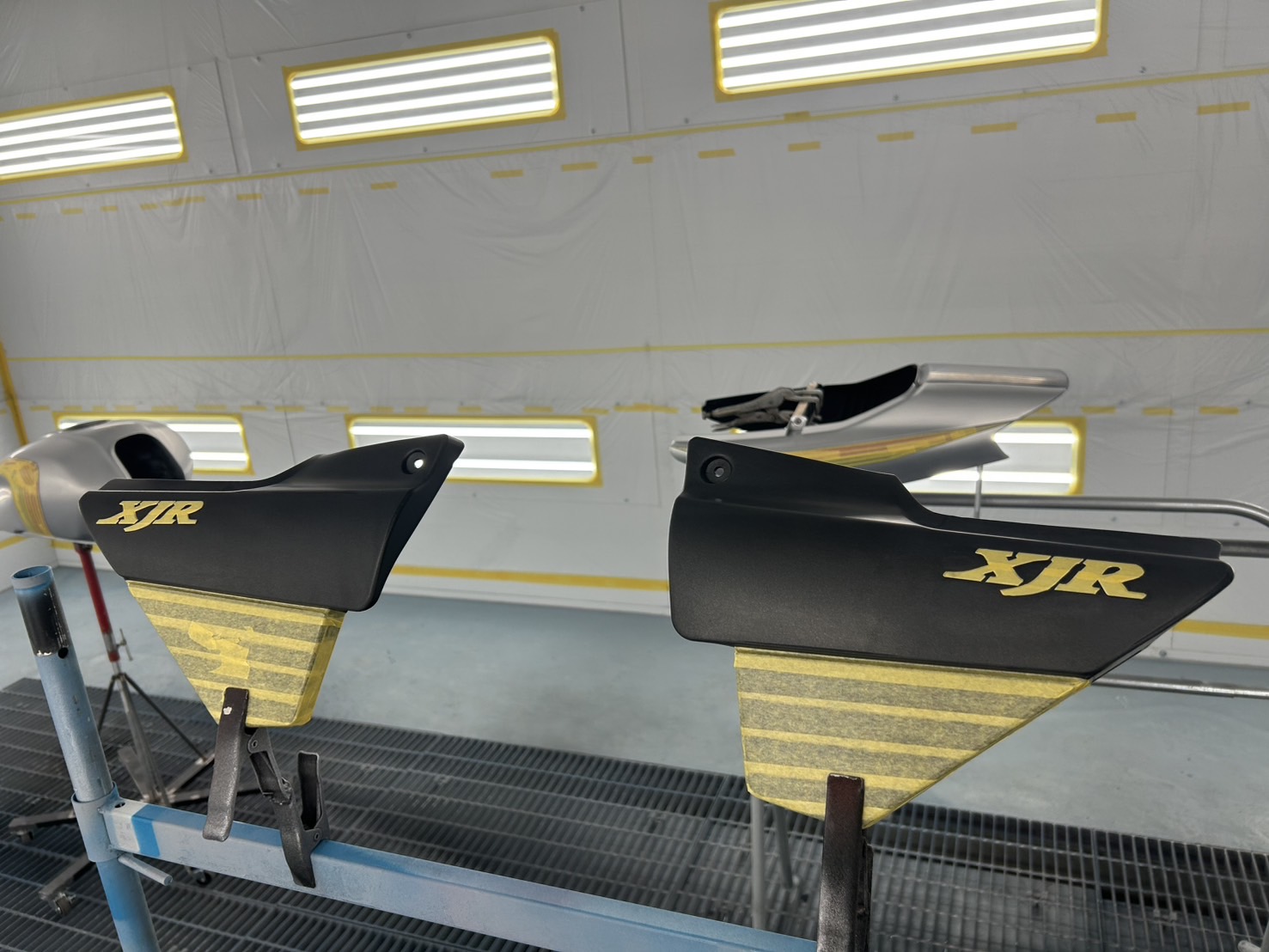 通常であれば白は、単色にするところを塗装工程が倍以上になるパールホワイトしたり、ライン部をデカール(ステッカー)で貼って済ましてしまいますがご用命によりライン部も塗装施工することになりました。